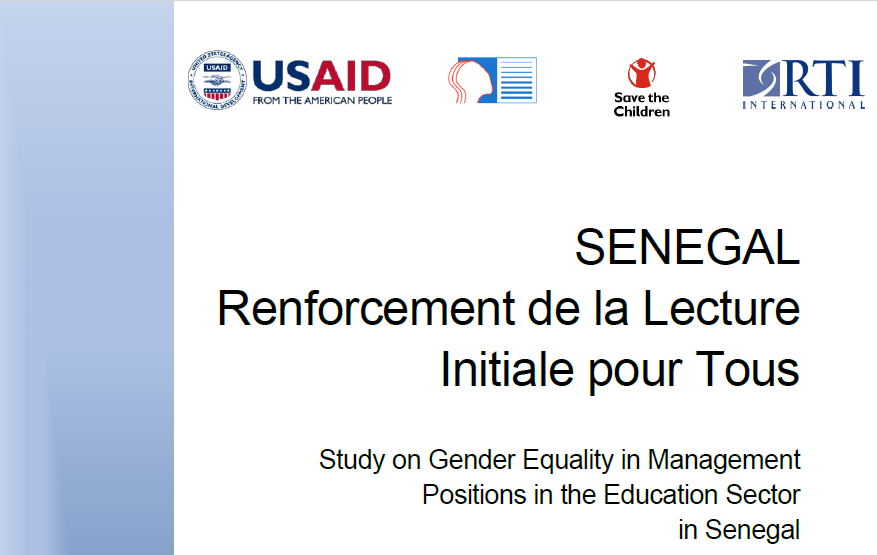 This study was undertaken for the Renforcement de la Lecture Initiale pour Tous (RELIT) program in Senegal, an activity made possible by the American people through the United States Agency for International Development (USAID). It is an analysis of gender equality and equity in positionsThe report includes an executive summary in English is followed by the full data and analysis from the activity, in French.